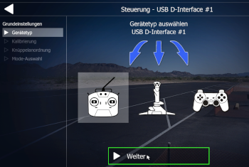 1. Schritt: Starten Sie den aeroflyRC zunächst ohne USB-Interface. Wenn die Installation der Software korrekt erfolgte, startet die Software wenigstens mit einem Modell in einer Landschaft. Öffnen Sie nun im blauen Startbildschirm den Menüpunkt „Steuergerät“ und schließen das USB-Interface an einen USB-Port direkt im Computer an. Danach auf „Geräte aktualisieren“ klicken. Nun sollte der Name des Interfaces angezeigt werden. Wenn das Interface im aeroflyRC10 an diesem Computer noch nicht benutzt wurde, erscheint die Meldung, dass das Gerät eine Grundeinstellung benötigt. Klicken Sie nun auf „Grundeinstellungen“. |
