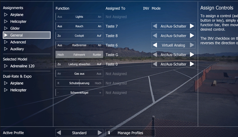 In the aeroflyRC10 you can fly in all 4 control modes, even with the throttle inverted idle position. In this step, set the desired control mode 1 to 4 by clicking on the band for the airplane and helicopter. “Inv” means a reverse idle position. You can check the correct setting by moving the joysticks.